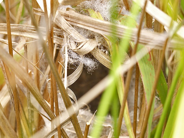 チガヤやカルカヤの地上20cmほどのところにクモの卵嚢から取った糸で生の葉を縫い合わせてつくる。